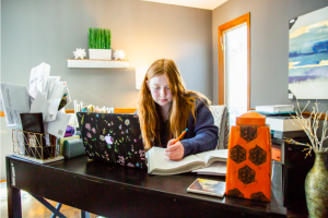 Magstadt moves around from day to day to switch up her learning environment, but she loves working at her breakfast bar in her kitchen.