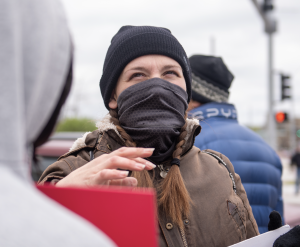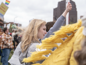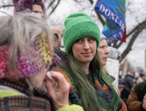 The crowd moved to the music rising from a circle of musicians drumming “Get Up, Stand Up” by Bob Marley. One woman with a GoPro danced in the center. The protesters lined the sidewalks and chanted “this is what democracy looks like.” Several attendees spoke about the sense of community and safety created at the rally, with people standing on trash cans and electrical boxes with crowds surrounding to catch them if they fall. Children could be seen bundled up in coats and mittens in strollers or on the shoulders of their parents, witnessing history.