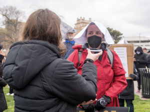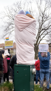 While most attendees were bundled up with red faces and frozen hands clutching onto their signs, some protesters found more creative ways to stay warm while expressing their anger. Three women, who wanted to remain unnamed, stood in long red robes with white visors, mimicking “The Handmaid’s Tale.”